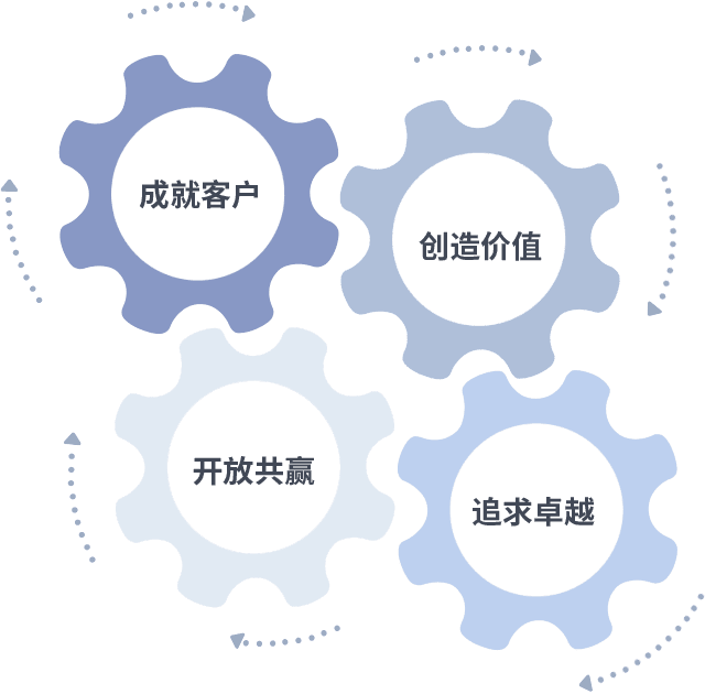 成就客户是一切决策的出发点,,,,创造价值是衡量所有工作的标准,,,,追求卓越是我们做事做人的态度,,开放共赢是我们的格局也是最终的结果。。。价值观的齿轮环环相扣,,推动着组织里的每个人不断向前。。