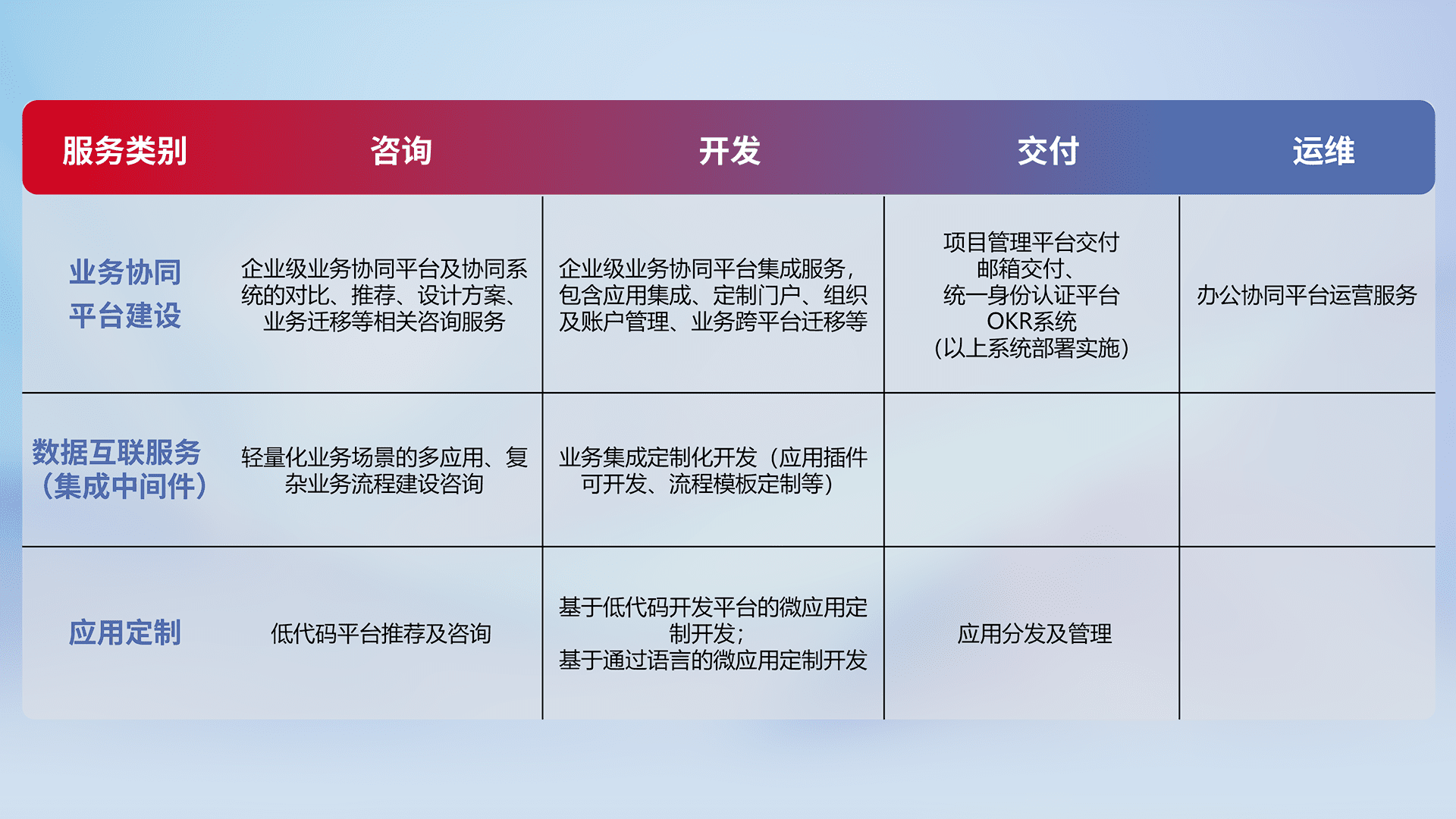 针对钉钉、、、企微、、、、IDaas等平台级产品提供产品的规划、、、、方案、、、交付、、定制化开发等服务,,实现如统一协同办公、、智能客户服务、、、混合会议管理、、智能数据查询、、等业务场景,,,实现数字化转型。。。
